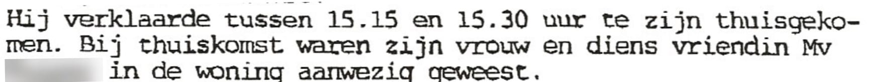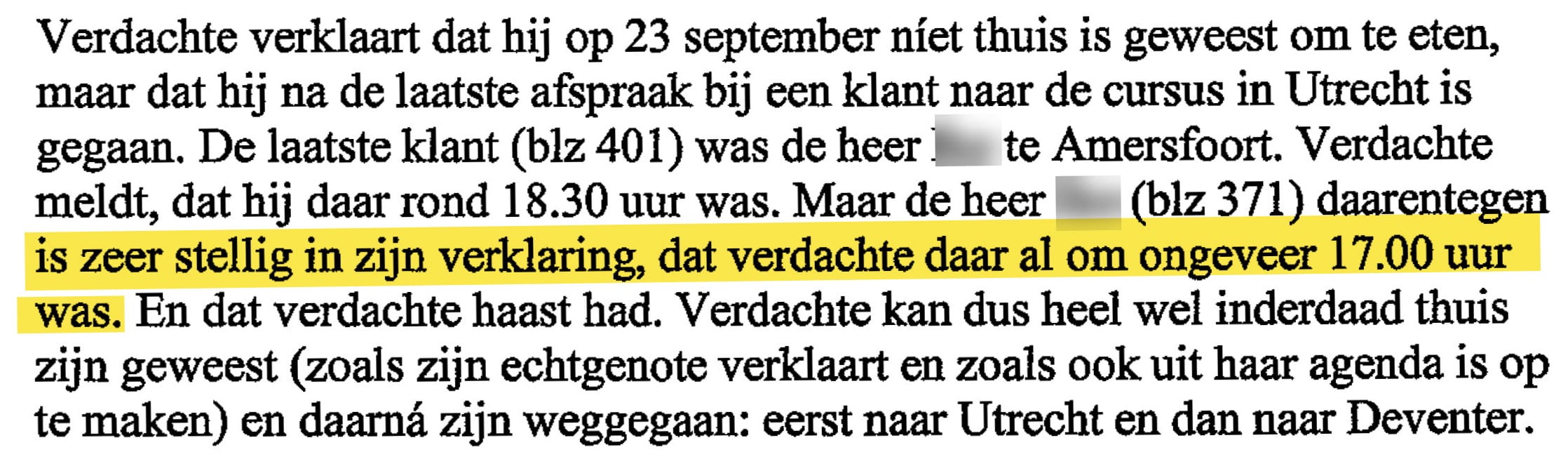 En hij verklaart ook tussen 15:15 en 15:30 thuis geweest te zijn. (Dat paste in zijn agenda met een klant om 13:30 uur in Almere en een klant om 16:00 uur in Lelystad.)