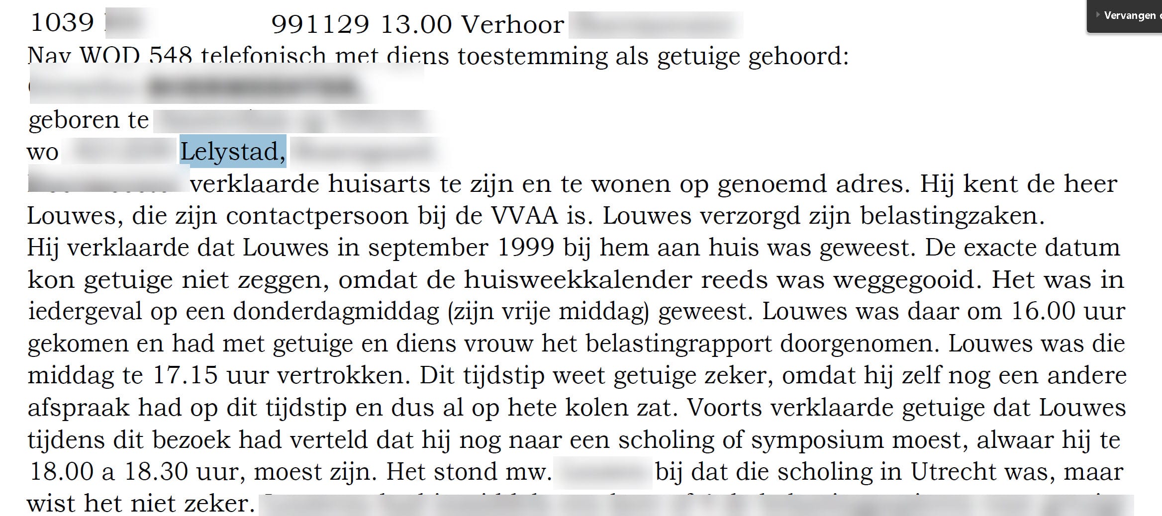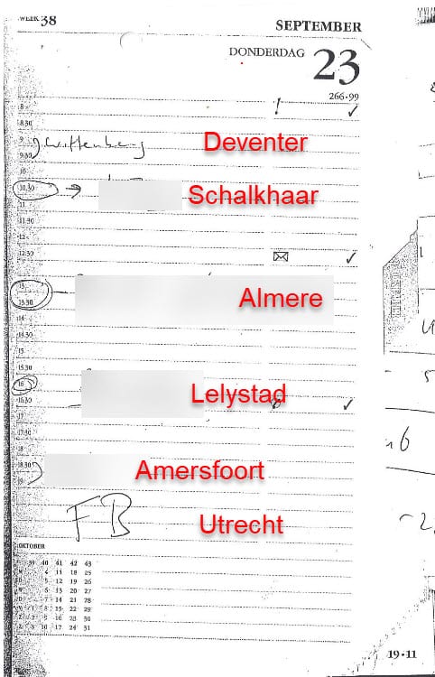 De klant uit Lelystad, die Louwes in zijn agenda had staan om 16 uur, bevestigt zijn komst op dat tijdstip en gaf aan dat hij om 17:15 uur weer vertrok (naar Utrecht).