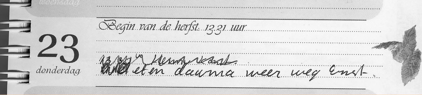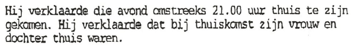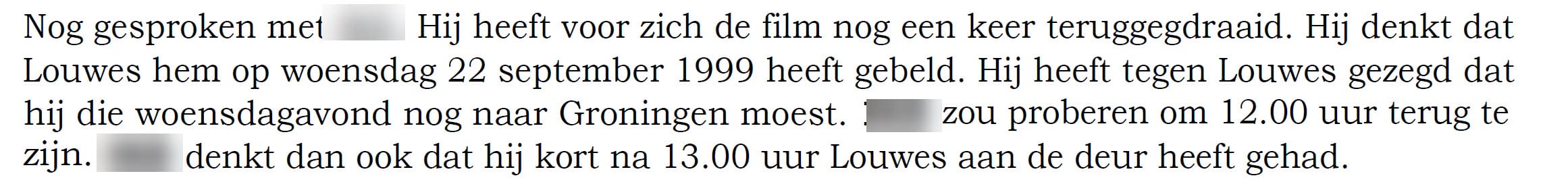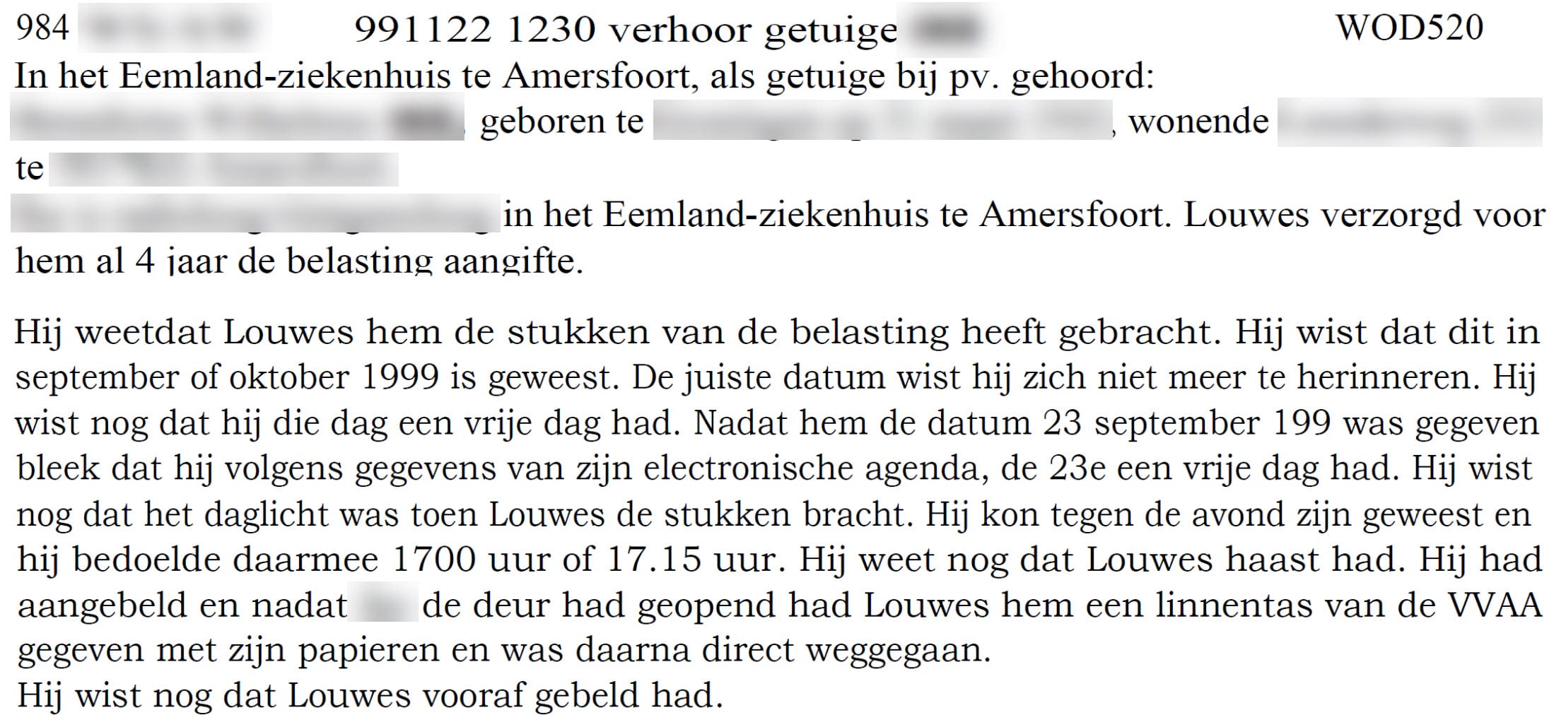 Later verklaart Mevr. Louwes zich vergist te hebben door de onduidelijkheid in de agenda van Louwes en dat hij ‘s middags was thuis geweest, hetgeen bevestigd wordt door de vriendin die toen ook aanwezig was en door Louwes ook op 19-11 aan de politie is gemeld.