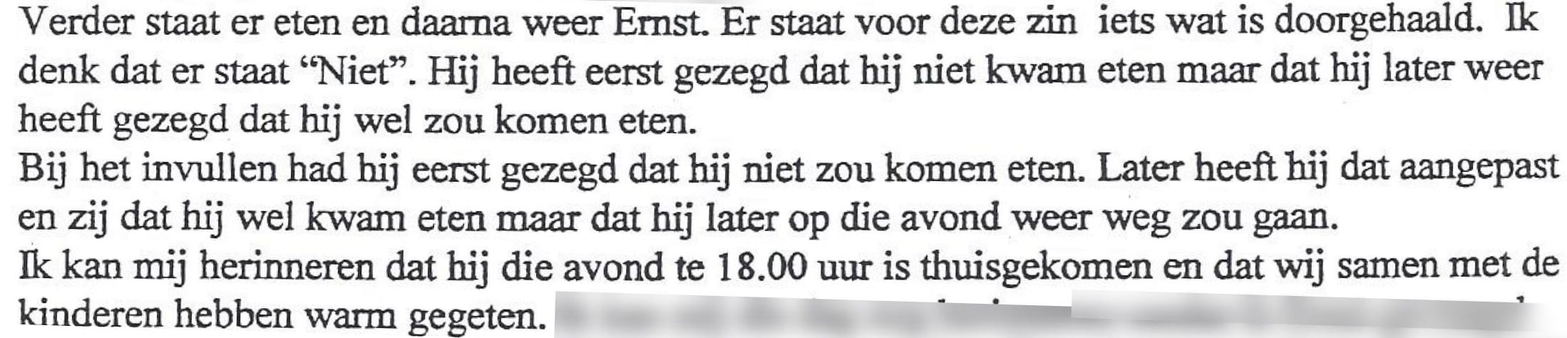 Zijn vrouw stelt, 2 maanden na dato, op basis van de huisagenda dat Ernst thuis gegeten moet hebben en ‘s avond laat thuis kwam.