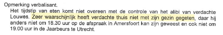 Louwes’ alibi dat hij om 21 uur thuis kwam werd niet door zijn vrouw bevestigd. Hij zou thuis hebben gegeten, weg zijn gegaan en na 22 uur thuis gekomen zijn. Maar wat stelde de politie vast en hoe ging het OM ermee om?